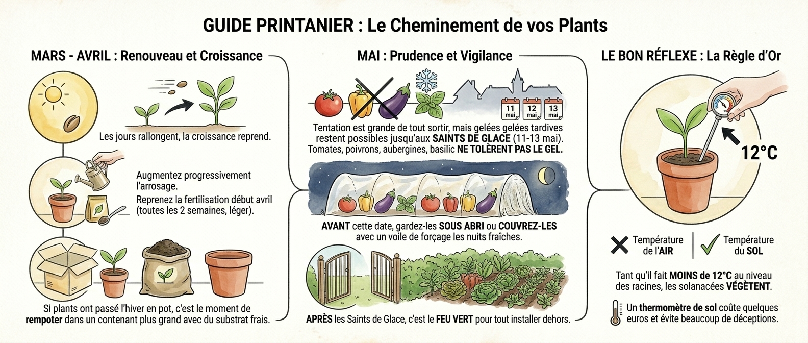 Le bon réflexe : ne vous fiez pas à la température de l'air. Ce qui compte, c'est la température du sol. Tant qu'il fait moins de 12°C au niveau des racines, les solanacées végètent. Un thermomètre de sol coûte quelques euros et évite beaucoup de déceptions.