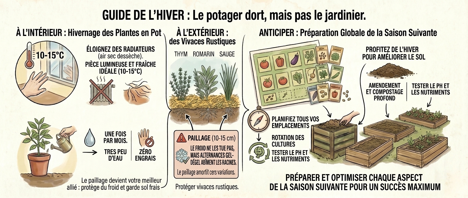 À l'intérieur : les plantes vivaces hivernées en pot ont besoin de très peu d'eau (une fois par mois maximum) et de zéro engrais. Éloignez-les des radiateurs — l'air chaud et sec les dessèche. Une pièce lumineuse et fraîche (10-15°C) est idéale.